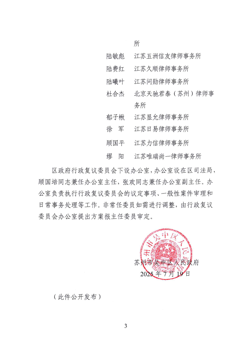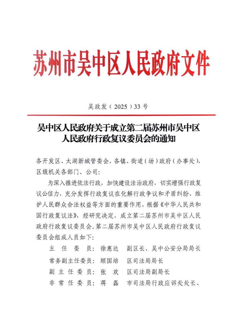 吳中區人民政府關于成立第二屆蘇州市吳中區人民政府行政復議委員會的通知